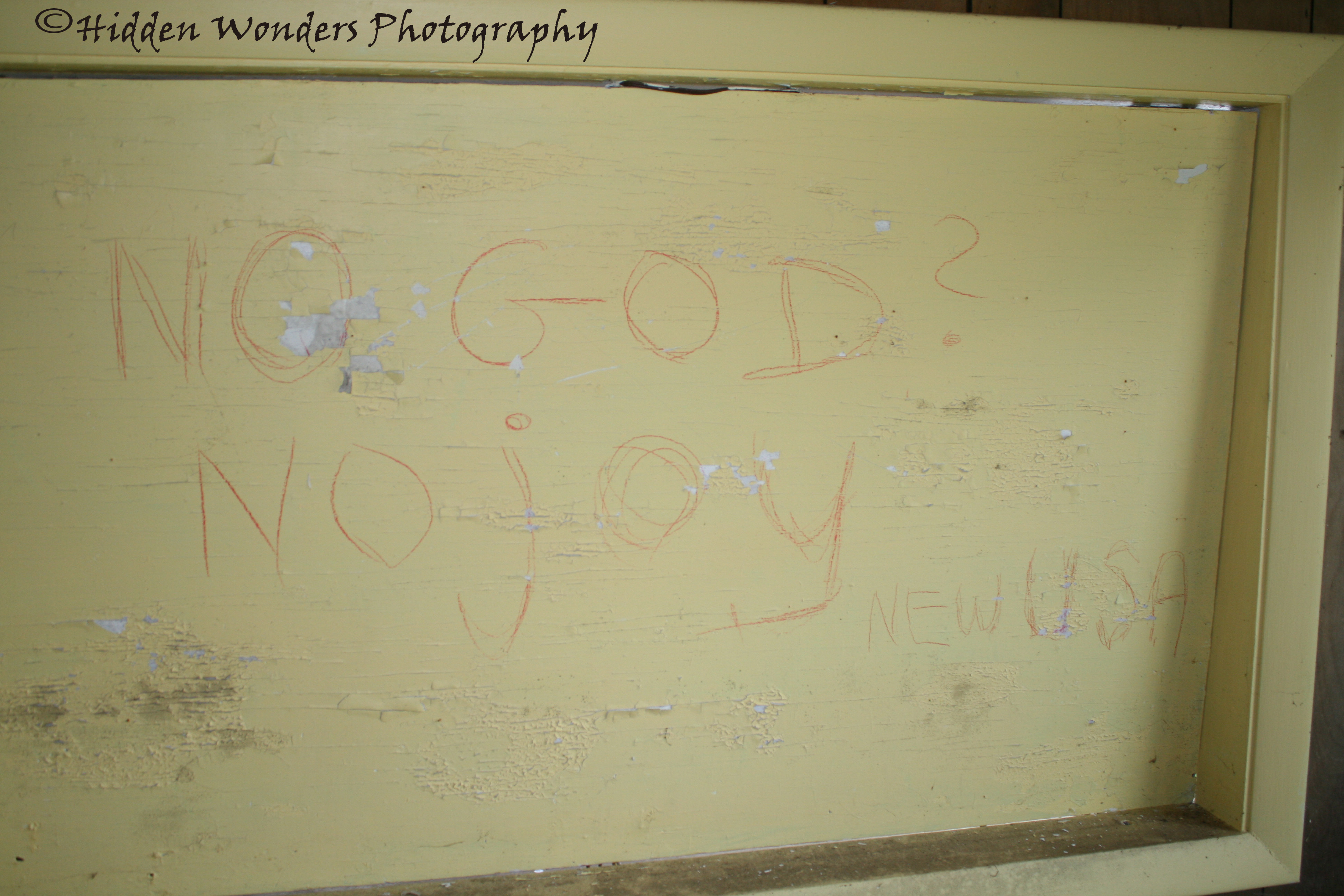 This was the only real philosophical piece of artwork we’ve ever seen in an abandoned place. Usually they’re just plastered on road signs or bumper stickers. But it does make sense…