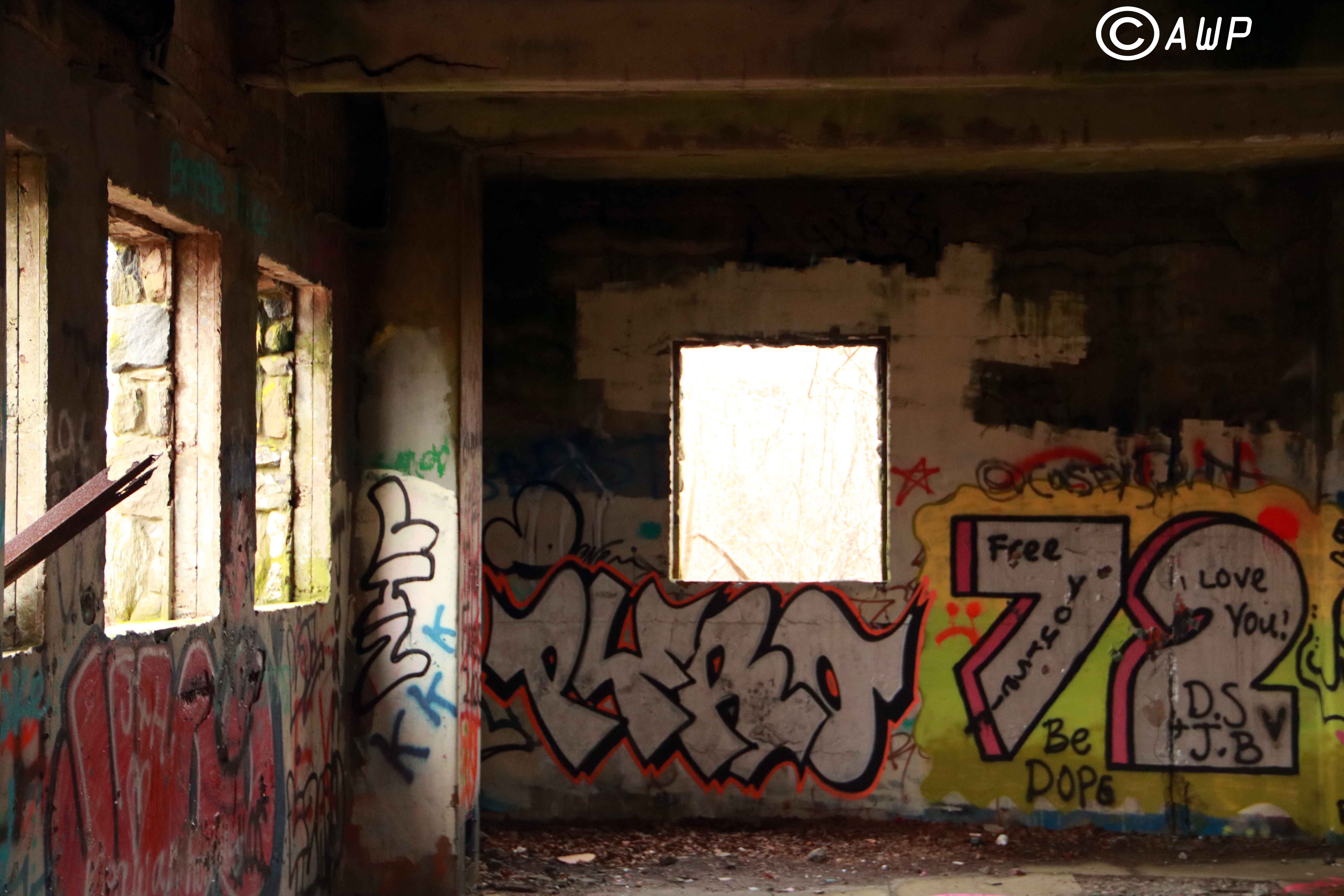 The second level of the house features the former art gallery of Jaimie’s work and is the landing zone for the vibrantly colored playground slide above. Many curious drawings and paintings still hang on the wall. A well loved armchair hangs out here too. But the third floor is what everyone wants to hear about, right. Because trampolines are fun! Though I could not fit down the slide, being 6’3″, I confess to doing my fair share of jumping on the trampoline. It once served as the family’s recreation area and believe me, there is still plenty of fun to be had here. A steel step ladder is suspended by climbing ropes above the trampoline which leads to the upper nest. A worn out mattress rests up here along with a colorful paintjob making the walls look like some sort of castle. It is also where I ran into a bit of trouble. Whilst climbing up to the house’s highest point, one of the climbing ropes holding up the ladder gave out. Luckily I was able to catch myself before tumbling all the way down. Maybe the trampoline would’ve held from my fall. Maybe it wouldn’t have. I’m glad I didn’t have to find out. Eventually, much like the Mantzel Family before me, the time came to say goodbye to this incredible place. Sun-burnt and bug-bitten, I bid farewell to the JME House and began my arduous quest back to the car. Down the mountain. Through the forest. Across the tunnel. Along the dirt road. Into town. Here at last, my journey came to an end and I began the long drive back home.
